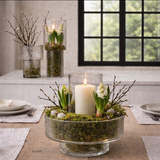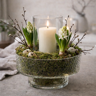 Diese stilvolle Tischdeko kombiniert gehämmertes Glas, natürliches Moos, zarte Frühlingsblumen und warmes Kerzenlicht zu einem modernen, zeitlosen Highlight für deinen Esstisch.