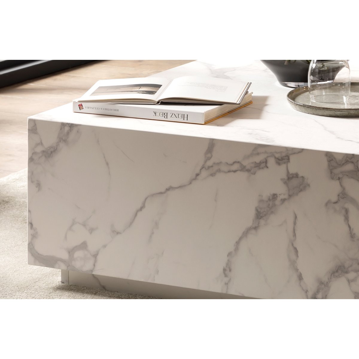 Dieser schicke Couchtisch lässt Ihr Wohnzimmer gleich viel edler wirken. Die schlichte Würfelform mit viel Fläche bringt die tolle weiße Marmoroptik besonders zur Geltung. Die niedrige Höhe zaubert einen modernen Loungecharakter in Ihr Zuhause. Foliert mit Melaminfolie in Marmoroptik, Maße des Sockels: ca. 76x76x6 cm.