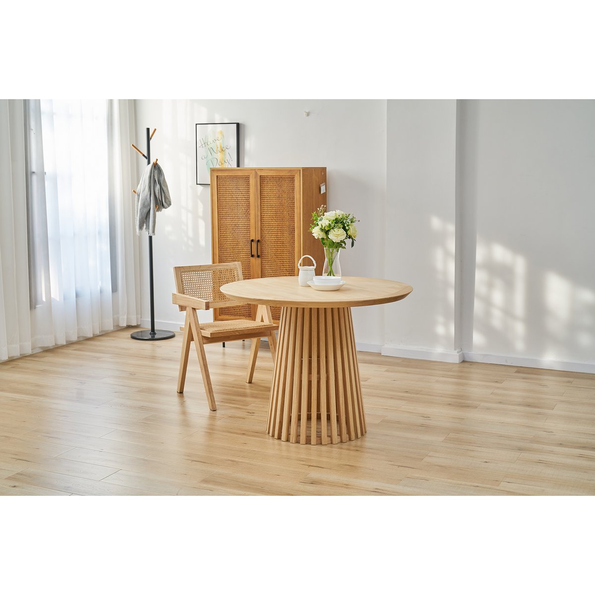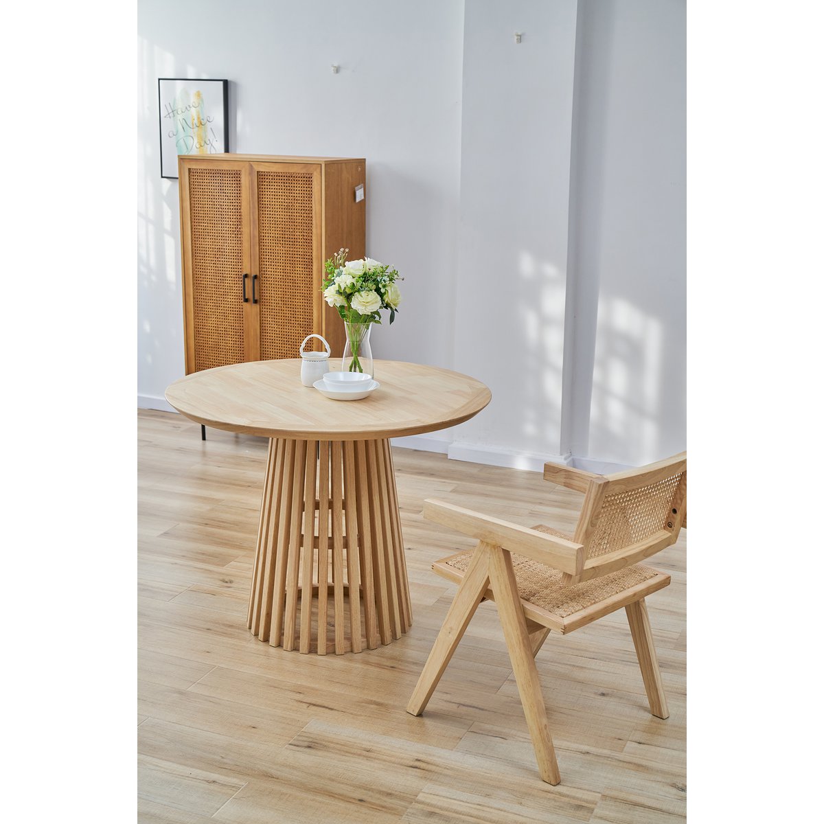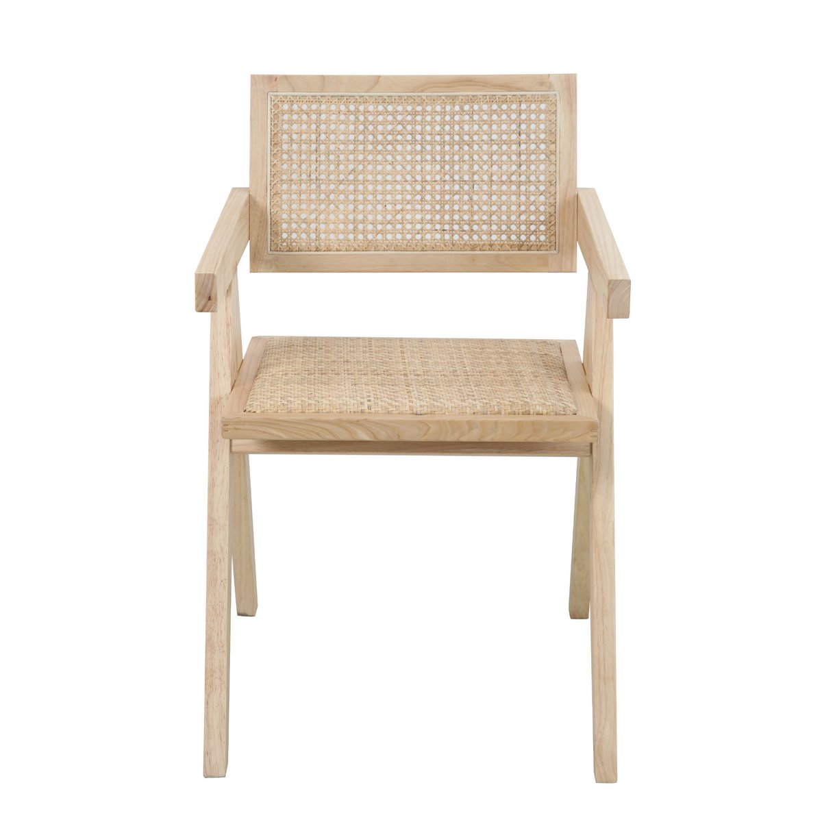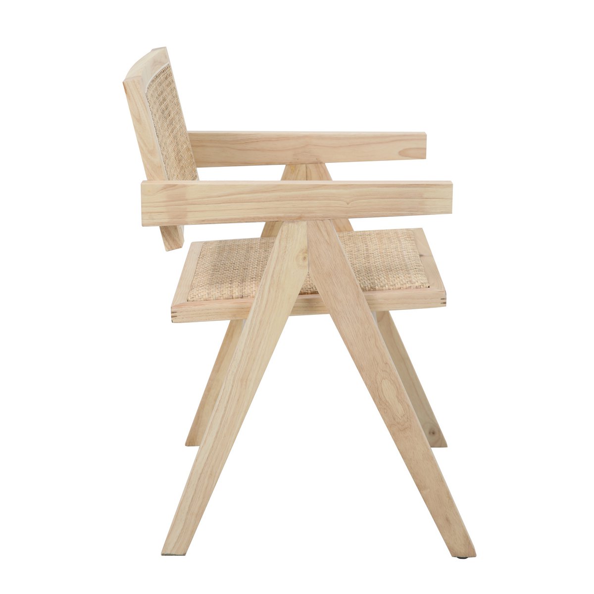 Die harmonische Kombination aus warmem Naturholz und geflochtenem Rattan schafft eine zeitlose Optik, die sich mühelos in verschiedene Wohnstile einfügt – von Vintage über Natural Living bis hin zu Modern Rustic. Die integrierten Armlehnen runden das Design ab und bieten zusätzlichen Komfort, ohne die Leichtigkeit des Stuhls zu verlieren.