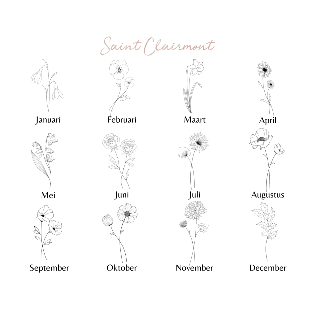 Goldene Geburtsblumen-Halskette aus Edelstahl. Jeder Monat hat seine eigene Geburtsblume. Eine Geburtsblumen-Halskette ist ein einzigartiges Geschenk, zum Beispiel zum Geburtstag oder als Geschenk zur Schwangerschaft.