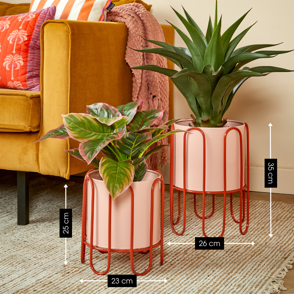 Mit den Dione Blumentöpfen auf Ständern von Mica Decorations präsentierst du deine Pflanzen besonders stilvoll. Die beiden Pflanzgefäße stehen auf eleganten Metallständern und bringen deine Lieblingspflanzen auf die perfekte Höhe. Die zwei harmonischen Rosatöne sorgen für einen modernen, frischen Look und setzen dekorative Akzente in jedem Raum.